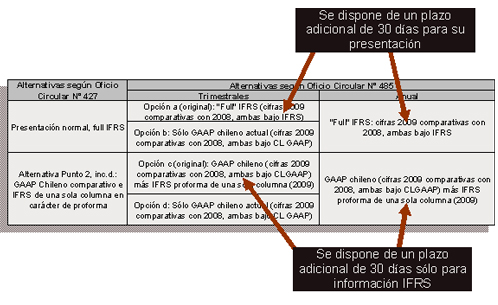 Sin embargo, a fines de 2008 la SVS emitió otro oficio en el que estableció la flexibilización en la adopción de normas IFRS. De esta forma, la superintendencia otorga dos opciones a las empresas respecto a su entrega de resultados. Éstas son: