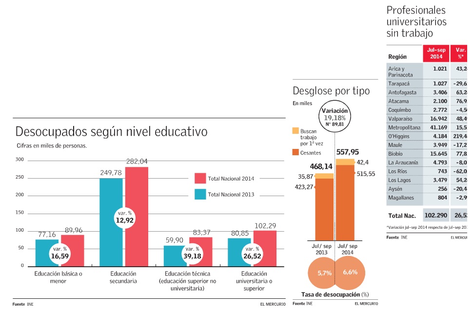 Según las cifras del INE del trimestre móvil julio- septiembre de 2014, versus el mismo período del año anterior, los desocupados con educación universitaria, postítulos, maestrías y doctorados, han aumentado 26,5% anual, pasando de más de 80.850 personas a 102.290 mil. Así, el número de profesionales desocupados aumentó en 21.450. El mayor incremento en el desempleo de profesionales en número de personas se observa en las Región del Biobío, Metropolitana y Valparaíso (ver infografía).