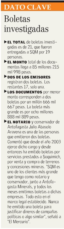 Los fiscales Carlos Gajardo, Pablo Norambuena y José Villalobos detectaron 21 boletas de más de un millón de pesos que pertenecen a julio de 2009 pagadas por SQM (entonces Soquimich) a 19 personas, sobre las que pidió determinar si efectivamente se realizaron los trabajos.