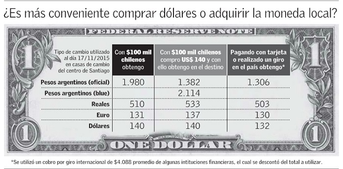 A días de que llegue diciembre y que la mayoría de los chilenos comience a planificar sus esperadas vacaciones, la conveniencia económica del destino a elección se torna de gran importancia. Por esta razón, se seleccionaron los destinos predilectos de los consumidores para determinar qué le conviene más a la hora de realizar el cambio de divisas o incluso para elegir adónde viajar. Después de analizar diversos factores, como los precios que se manejan en las casas de cambio del centro de Santiago, así como también los datos de cargos que cobran las tarjetas de crédito por realizar giros en el extranjero, el veredicto es que lo más conveniente para una persona que quiera viajar a Argentina, Brasil o Europa es comprar dólares en el centro de Santiago y luego traspasarlos a moneda local en el destino. En el caso de Brasil, por ejemplo, con $100 mil se podrán adquirir US$ 140, lo que se traducirá en un poco más de 530 reales, es decir, un 4,5% más de lo que se habría adquirido comprando directamente la divisa en Chile. Asimismo, si el plan es viajar a algún lugar de Europa, como España, Alemania o Italia, entre otros, la situación se repite. Realizando el traspaso de los dólares comprados en Chile a euros en el país de destino, los viajeros podrán obtener una ganancia en torno a los seis euros. Si el destino es Argentina, la situación varía dependiendo de si el cambio se hace a través del precio del dólar oficial o blue . Si se cambian $100 mil en Santiago, se obtendrán 1.980 pesos argentinos, mientras que si se viaja con dólares (US$ 140) y se cambian de manera oficial en Argentina, se conseguirán 1.382, un 30% menos. El cambio será mejor si se recurre al blue , ya que se pagarán 2.114 pesos argentinos. Otra de las opciones es comprar directamente con la tarjeta de su institución financiera; sin embargo, esta es la menos conveniente, ya que, dependiendo del tipo de cuenta, considera un cobro adicional de entre los US$ 8 y US$ 3 por giro.