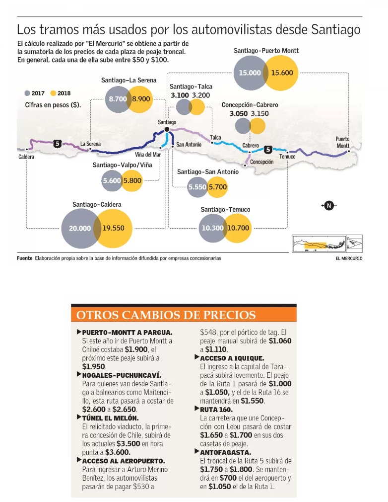 tramos troncales, en la Ruta 5, y doce transversales anunciaron alzas en 2018.