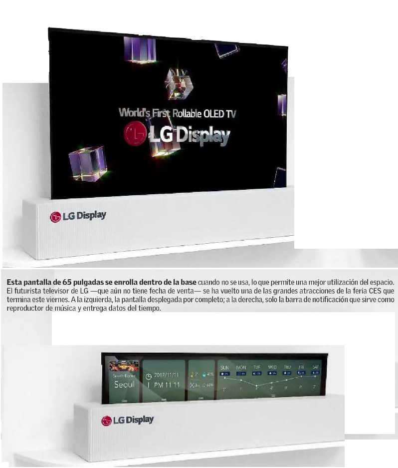 Es el evento de tecnología más importante del planeta y, sin embargo, no es infalible. Ayer, durante la segunda jornada de la CES 2018, un corte de luz obligó a suspender las actividades de la feria por más de dos horas. La oscuridad se apoderó de los luminosos stands y pasillos del Centro de Convenciones de Las Vegas y el público tuvo que abandonar el recinto. Así, hubo que esperar para observar en vivo algunas de las novedades de esta versión. Se ve como un televisor más, pero cuando no se está usando, se puede enrollar y queda guardado en su misma base. Así es el modelo de 65 pulgadas que presentó la compañía coreana LG en la feria. Los televisores son siempre uno de los principales atractivos en este evento, y 2018 no ha sido la excepción. Sobre todo porque es un año clave para la industria: en junio, Rusia será la sede del Mundial de Fútbol, un evento que acapara la atención de millones de telespectadores en el mundo y que hace que la venta de equipos se dispare. Lograr la mejor calidad de imagen y sonido posible, mejor que estar en el estadio, ha sido la meta de los fabricantes. Y es lo que ofrecen, en diferente grado, los modelos presentados estos días en Las Vegas. El futurista televisor LG enrollable no solo adquiere diferentes tamaños -si se despliega solo una parte, se puede usar como un reproductor de música o notificador del clima o noticias; en su máxima capacidad, permite ver películas-, sino que también cuenta con una pantalla con resolución 8K, el doble de lo que ofrecen los modelos de gama alta en la actualidad. Si el 4K multiplicaba por cuatro las virtudes del Full HD, el 8K lo hace por 16. En CES se perfilan las tendencias que seguirá el mercado y todo indica que el 8K es el futuro inmediato. Aunque el contenido disponible para ellas es casi inexistente. "Los canales tendrán que comenzar a producir contenidos en esta resolución", comenta Ji Hee Lim, product manager de TV y Audio de Samsung Chile. La compañía surcoreana es una de las que han puesto mas énfasis en esta nueva tecnología, y sus modelos presentados en CES 2018 ya la incluyen. Como The Wall, un gigantesco panel de 146 pulgadas. Se trata de un televisor ultradelgado y modular, es decir, está conformado por diferentes paneles que se pueden instalar según el interés del usuario para darle el tamaño que desee. Sus modelos también estrenarán la nueva tecnología microled, que utiliza un material inorgánico que genera su propia fuente de luz y evita la oxidación y pantallas "quemadas", ofreciendo una reproducción de negros casi perfecta y una gran fidelidad de color. Estas pantallas saldrán al mercado durante el segundo semestre, incluido Chile. Ante la falta de contenidos 8K, los televisores de Samsung cuentan con un algoritmo de inteligencia artificial que adaptará los contenidos actuales para transformarlos en algo muy similar, como explica ji Hee Lim. Sony también apostó por pantallas grandes con sus televisores de la serie X900F, que van desde 49 pulgadas hasta 85 pulgadas. Esta nueva familia de televisores ofrece, además, una tecnología de superficie acústica que permite que la pantalla entera resuene con un gran sonido, para una unificación perfecta de imagen y sonido. Y aunque no es un televisor, Google reveló cuatro nuevos dispositivos inteligentes diseñados para competir con la Echo Show de Amazon. Se trata básicamente de pantallas -fabricadas por Samsung, LG y Lenovo- en las que se pueden proyectar contenidos en streaming o de YouTube.