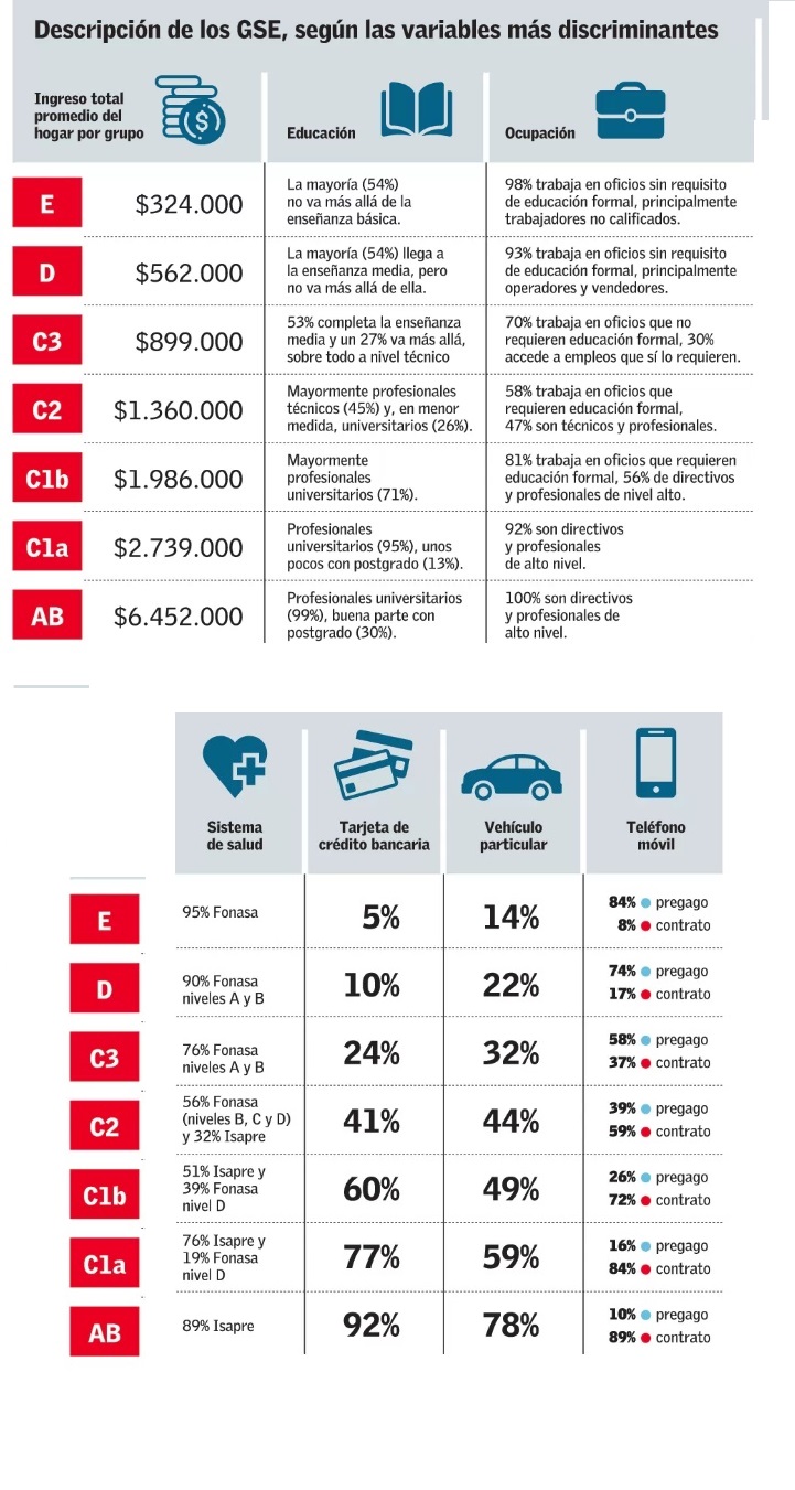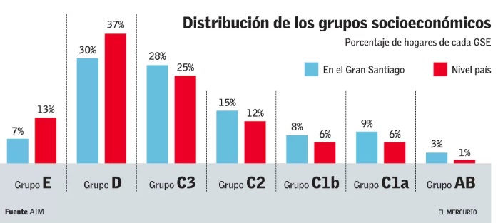 La Asociación Investigadores de Mercado (AIM), en la que participan empresas como GfK Adimark, Ipsos, Cadem y Nielsen presentó una nueva metodología para clasificar a los grupos socioeconómicos (GSE) con que usualmente se segmenta a la población chilena. La AIM destaca como la principal mejora del método para definir los GSE, el que por primera vez se basa netamente en cifras de acceso público, en específico la Encuesta Casen 2015 y la Encuesta de Presupuestos Familiares. Resultados En la información entregada por la AIM es posible apreciar que la Región Metropolitana es la que posee una mayor proporción de hogares en los estratos más altos, ABC1, con un 19,5%. Le siguen la Región de Tarapacá, con 17,2%, y la de Aysén con el 16%. La principal región minera de Chile, Antofagasta, se ubica recién en el quinto lugar con el 14,7%. En el extremo opuesto, la clasificación muestra que es La Araucanía donde se presenta una mayor proporción de hogares en el segmento más bajo, el E, con un 23,3%, seguida del Biobío con 18,5% y de Los Ríos con 18,4%. Según la AIM, la mayor parte de los hogares chilenos pertenece al segmento D, cuyo ingreso familiar promedio es de $562 mil y en los cuales el principal miembro sostenedor en su mayoría (54%) solo cursó estudios hasta la enseñanza media. A este estrato pertenece el 37% de los grupos familiares, misma proporción de hace una década. En este segmento un 22% de los jefes de hogar tiene auto y un 10% tarjeta de crédito. Le siguen en preponderancia, siempre a nivel nacional, el segmento C3 (25%), E (13%), C2 (12%), C1b y C1a (ambos con 6%) y finalmente el AB, con 1%. Por su parte, en el Gran Santiago también predomina el segmento D (30%), pero aumenta en peso relativo el C3 (28%), seguido por el C2 (15%), el C1a (9%), el C1b (8%), el E (7%) y el AB (3%). Así, en la gran capital un 20% de los hogares corresponde al agregado ABC1.