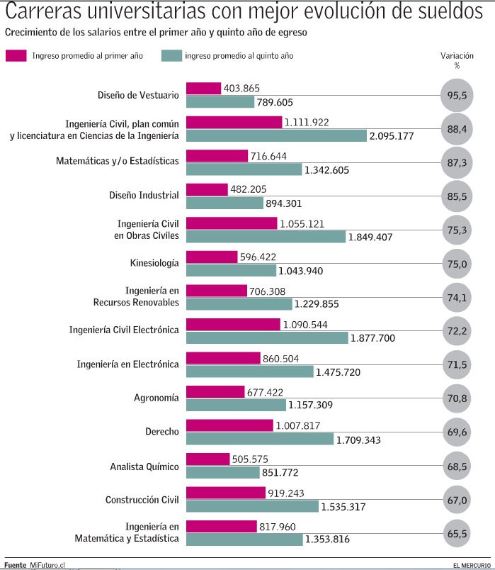 De las "top ten", siete carreras con los salarios más altos de Chile son ingenierías. Una lista que se completa con los médicos, los abogados y los geólogos. Estos últimos, muy apetecidos también en el mercado laboral por su escasez y la posibilidad que tienen de desempeñarse en cualquier lugar del mundo donde se requieran sus servicios.
