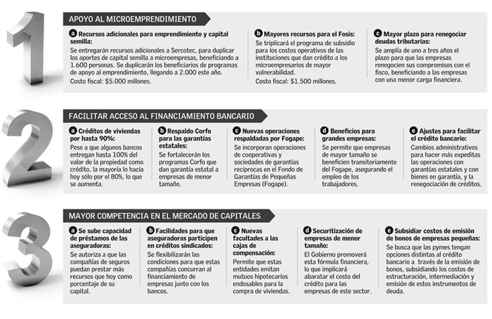 El primero se centra en apoyar y fomentar el emprendimiento, a través de mayores recursos para Sercotec y el Fosis, lo que implicarán un gasto de $6.500 millones. Además, incluye la ampliación de uno a tres años para que las pymes renegocien sus deudas tributarias.